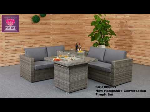 If you're looking for the perfect set of patio furniture to enjoy long summer evenings with your family, the New Hampshire Fire Pit Patio Furniture Set is the way to go. This set features a fire pit that's set in the centre of a large table, and with a simple battery operation, you can cast a warm, cosy glow across your outside space. The table is built with a ceramic glass top and a glass safety cage around the pit, ensuring it's safe to use and sit around. With two two-seater sofas, this furniture set is large and luxurious. The side cushion box can be pushed together to create a corner sofa, so you and your loved ones can all sit around the fire together. The New Hampshire Set is built from strong materials, including a rust and corrosion-resistant aluminium frame and PE synthetic rattan that protects against UV rays to ensure the design stays attractive throughout the years. Each sofa is topped with super plush, inviting cushions to add a high level of comfort.